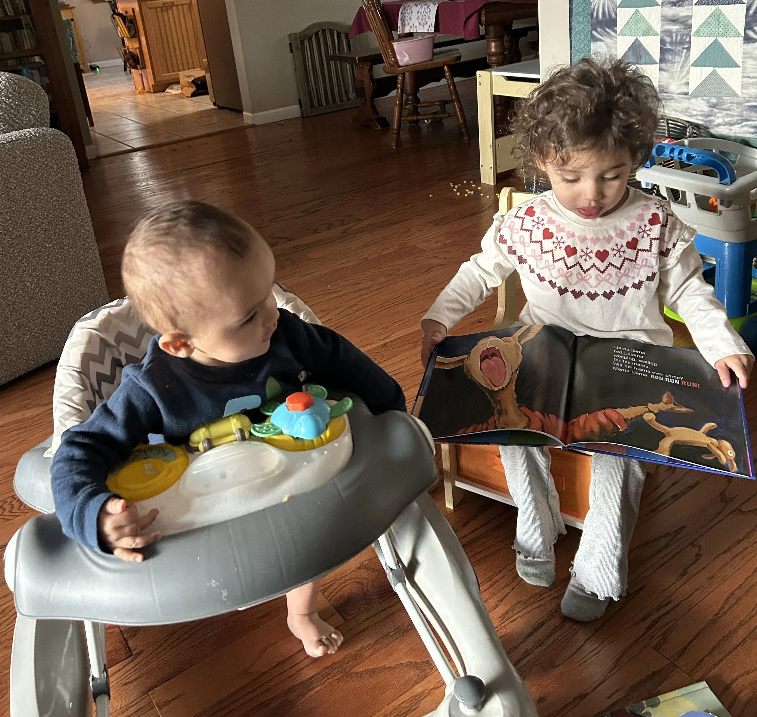 Keep Going picture of the months is ... .my great-granddaughter “reading in 2 year old gibberish” to her nine month old brother!